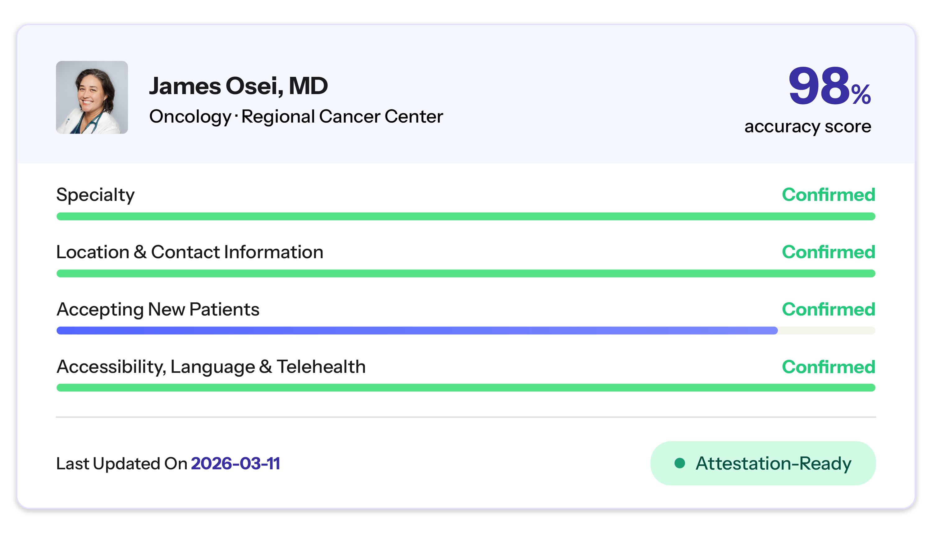 Our platform continuously verifies provider directory data at the record level, confirming that providers are reachable, actively practicing, correctly attributed to the appropriate networks and locations, and accurately reflecting their accepting status. The verification timestamps we generate align directly with the lastUpdatedOn field CMS requires in every submitted record, giving MA plans a credible, independently verified compliance artifact rather than a self-reported timestamp.