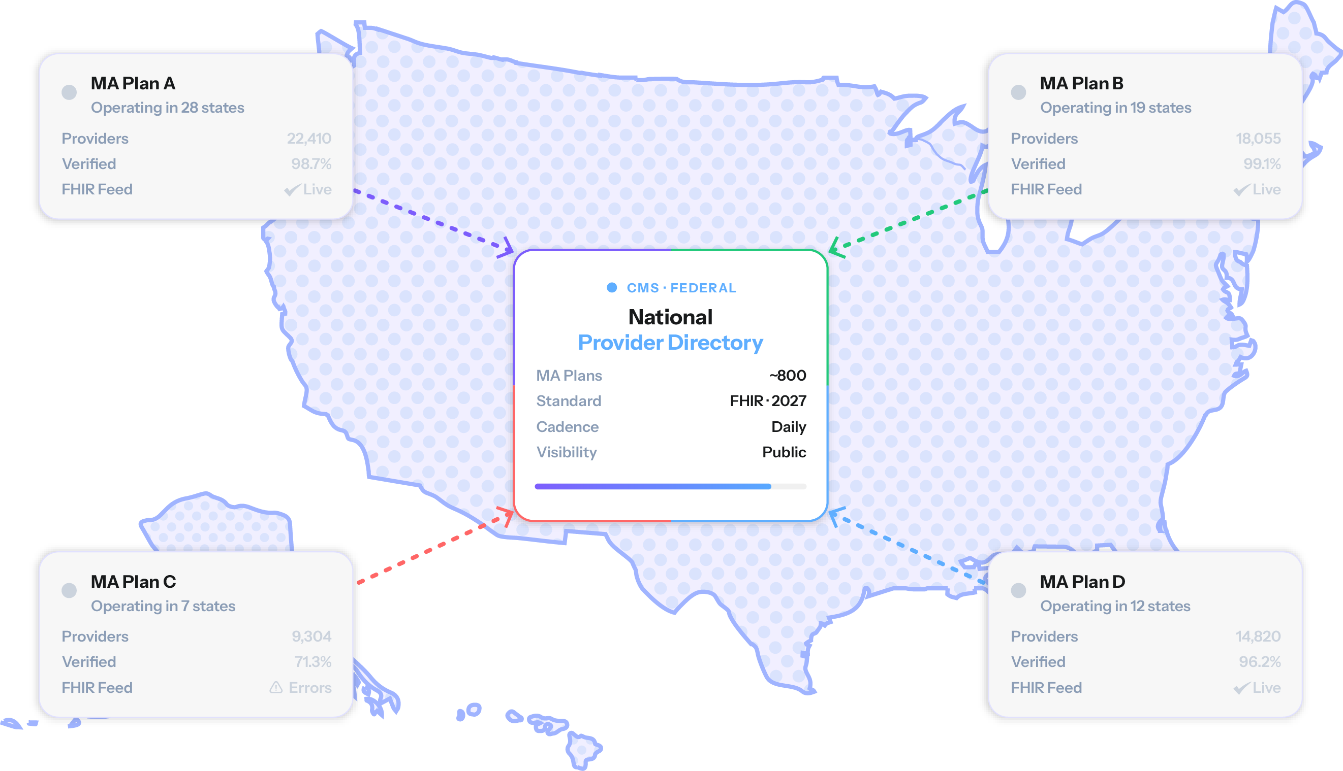 The implication for MA plans is more consequential than a simple compliance requirement: your provider directory data is becoming foundational infrastructure for a federal system. Starting in 2027, FHIR will be the only accepted submission format as CMS phases out machine-readable JSON and moves toward a fully interoperable national directory. Whatever data quality problems exist in your directory today will flow directly into that system—publicly visible, updated daily, and attached to your organization's name.